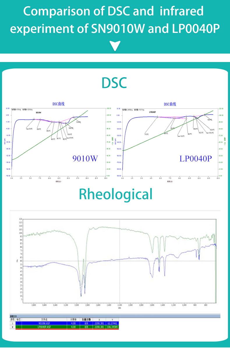 સૈનુઓpe મીણ સારી સફેદતા, સારી કઠિનતા, સારી તેજ, ​​સારી ભેદ્યતા, ચપળતા, નાની ગંધ,ધુમાડા રહિતઉચ્ચ કઠિનતા;ઓછું થર્મલ વજન નુકશાન, નીચા rheological ઇન્ડેક્સ, સારી લ્યુબ્રિકેશન અને વિખેરવું;વજન ઘટાડવાના માપમાં અસમાન ખોરાકની સમસ્યાનું નિરાકરણ;તમામ ઉચ્ચ-ગુણવત્તાવાળા ઓલિગોમર્સની લગભગ સંપૂર્ણ બદલી, તે 0020P, 0040P ને બદલી શકે છે.